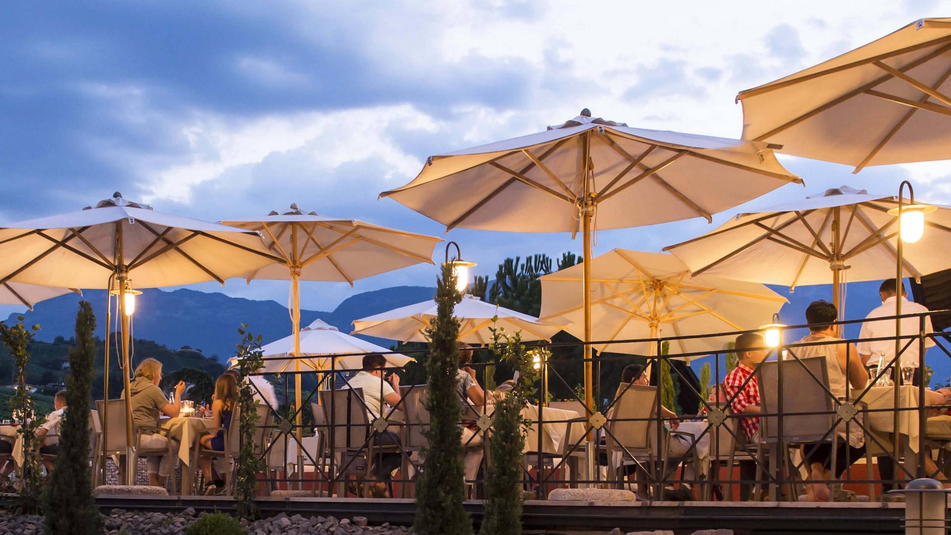 Die Kräuterterrasse zum Frühstück-, Mittag- und Abendessen (bei schönem Wetter) mit Blick auf Apfelgärten und Weinberge ringsum. Für gesellige Stunden mit Familie, Freunden oder ganz romantisch zu Zweit. Der überaus zuvorkommende Service draußen oder drinnen, in den gepflegten Speiseräumen, trägt zusätzlich dazu bei, dass Sie sich alle rundum wohlfühlen.