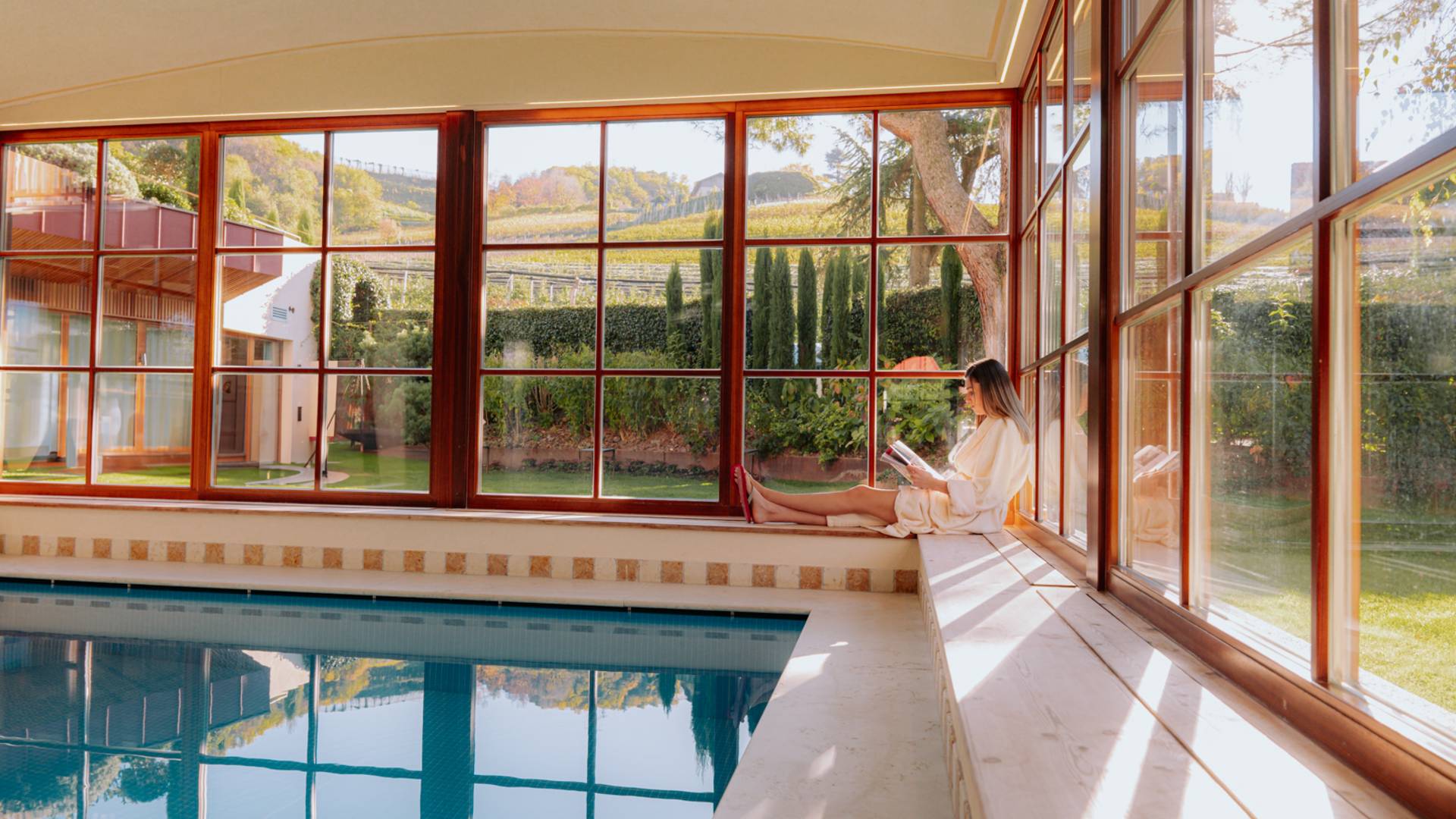 Im mediterranen Garten am Außenpool. Auf den Relax-Liegen direkt am Pool oder einer der Ruheoasen mit Pergola über der Poollandschaft. Der Lieblingsplatz der Kinder: das Kinderbecken mit Wasserrutsche. Der Spielplatz mit attraktiven Spielmöglichkeiten. Im Innenbereich finden Sie das Hallenbad mit Whirlpool und Kinderbecken sowie den gemütlichen Saunabereich und lichtdurchflutete Ruheräume. Hier, mit Blick ins Grüne, lässt es sich wunderbar dösen, lesen und relaxen.